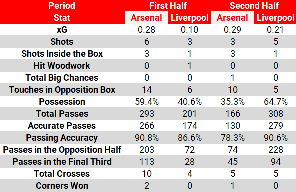 Liverpool went from just over 40% possession in the first 45 minutes, to just under 65% in the second. From 28 passes in Arsenal’s defensive third, to 94.