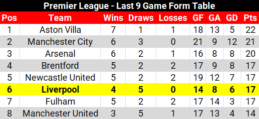 In fact, Liverpool are unbeaten in nine Premier League games (W4 D5) but are 6th in the form table in this time. Not 4th.
