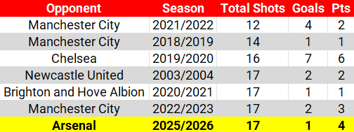 Arsenal really don’t give away a lot defensively - it’s why they are top of the league. In two games against them this season, Liverpool have had just 17 shots in total. On Opta’s records, on just three occasions have the Reds had fewer across both meetings in a league season: