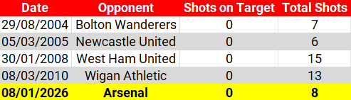 Opta have shot data in Premier League matches since 2003-04 - Thursday was just the fifth time the Reds failed to have one on target in a league match since: